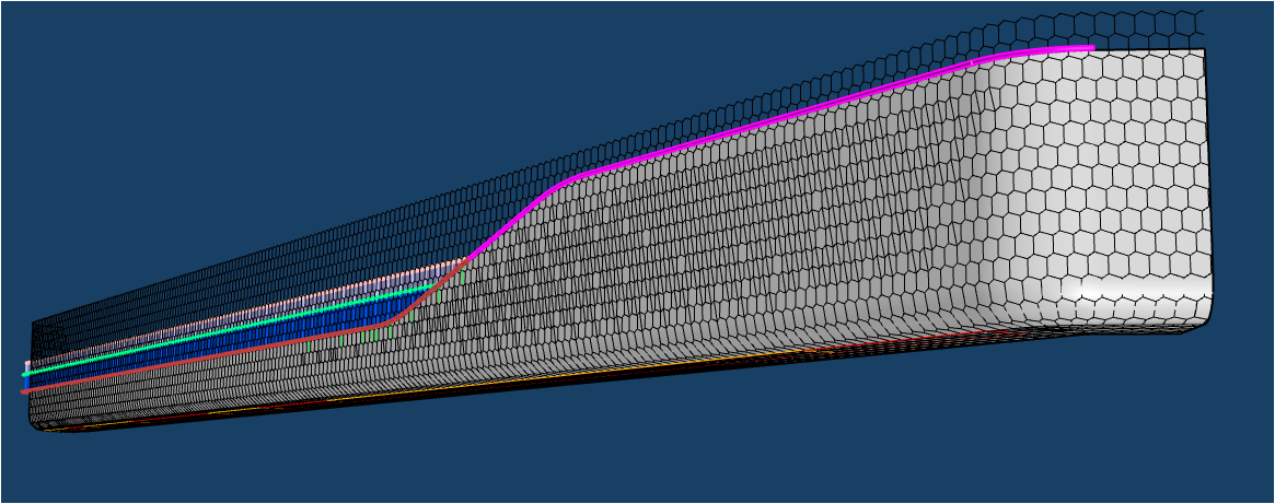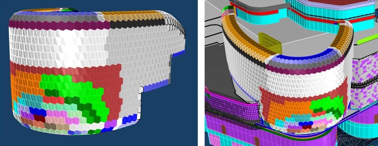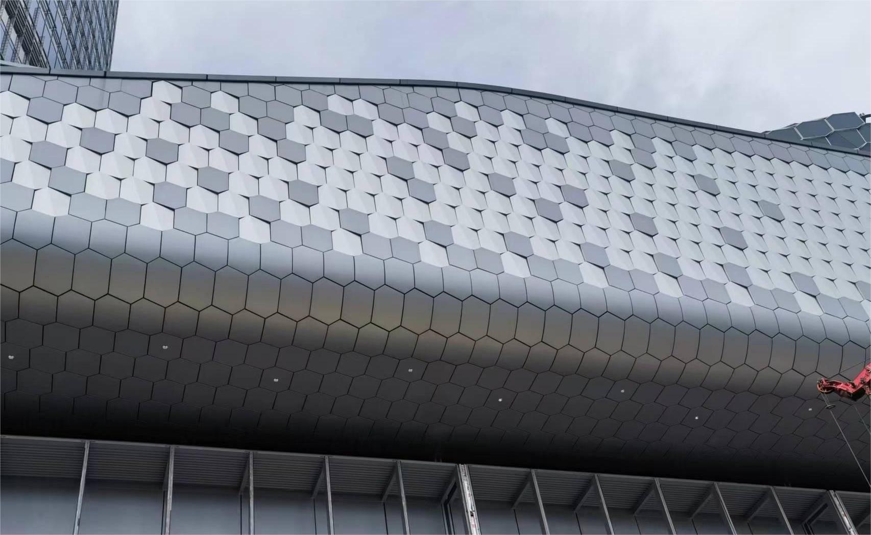 南裙樓船頭造型內(nèi)部鋼結(jié)構(gòu)均有扭轉(zhuǎn),要求拐角幕墻呈現(xiàn)雙曲面效果;屋檐幕墻設(shè)計(jì)圍繞龍鱗造型,分解為單片“六邊形”元素展開,拐角弧度造型對鋁板制造及安裝工藝要求極高。